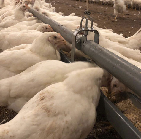 整列させてエサを食べさせ、いかに均等にえさを食べさせるかが重要です。均等なエサ量を食べれていないと、大きい鶏、小さい鶏と群の体重がばらつくためです。