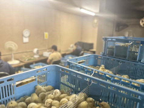 ヒヨコを出荷する雛箱には、夏期85羽程度、冬期100羽程度と季節によって入れる羽数を調整します。